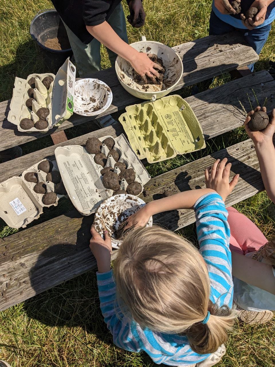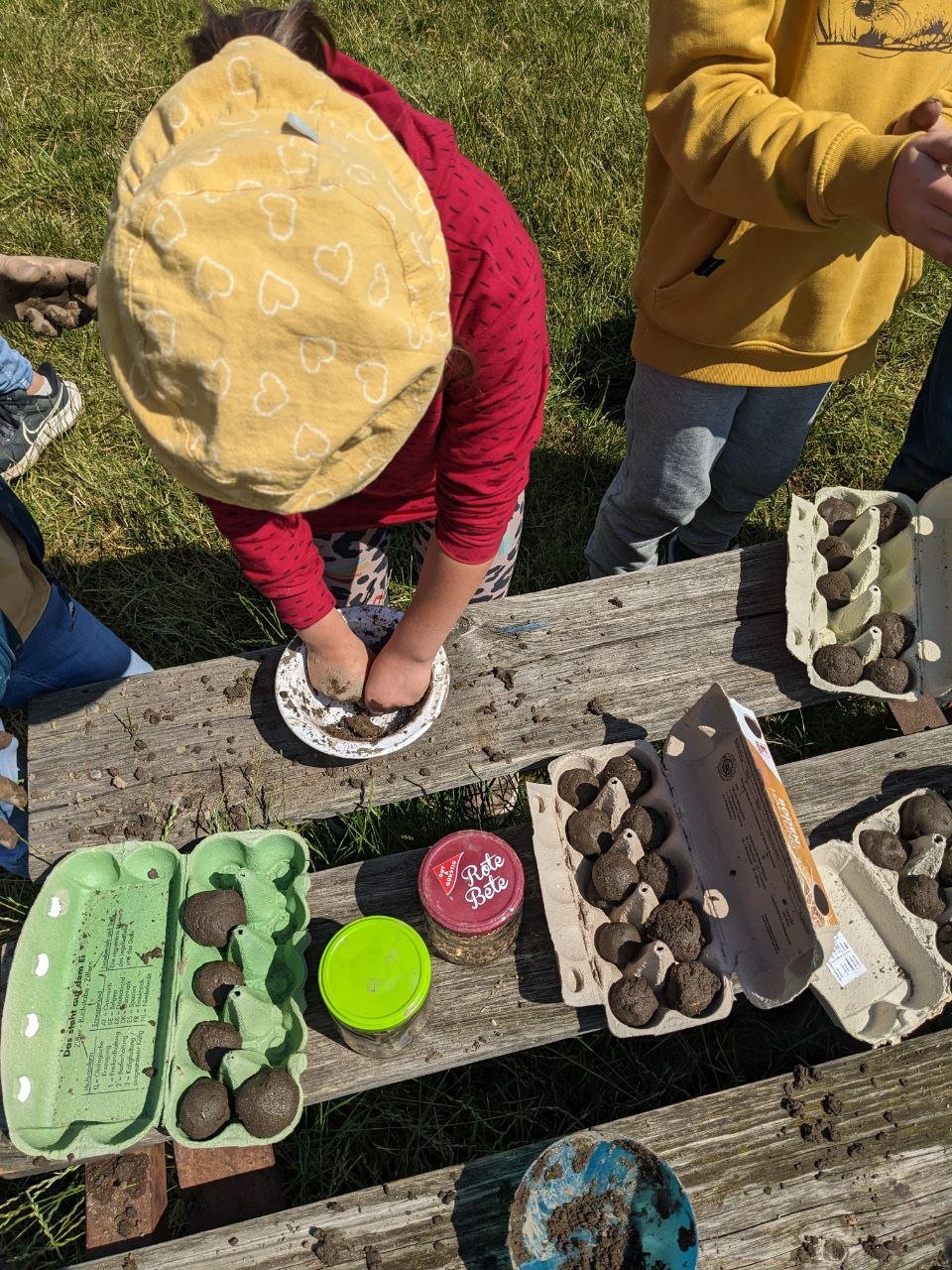 Anschließend haben wir die Klasse in Gruppen aufgeteilt, sie konnten nun eine Limo aus essbaren Beeren, Blüten und Kräutern pflücken und probieren. Außerdem haben wir auch Samenkugeln für eine grünere und falterfreundlichere Stadt geformt. Dabei haben wir aus Lehm, Sand und frischer Komposterde eine Art Teig geknetet, diesen zu einer Kugel gerollt und dann in der Mitte Samen von Wildblumen eingeschlossen.