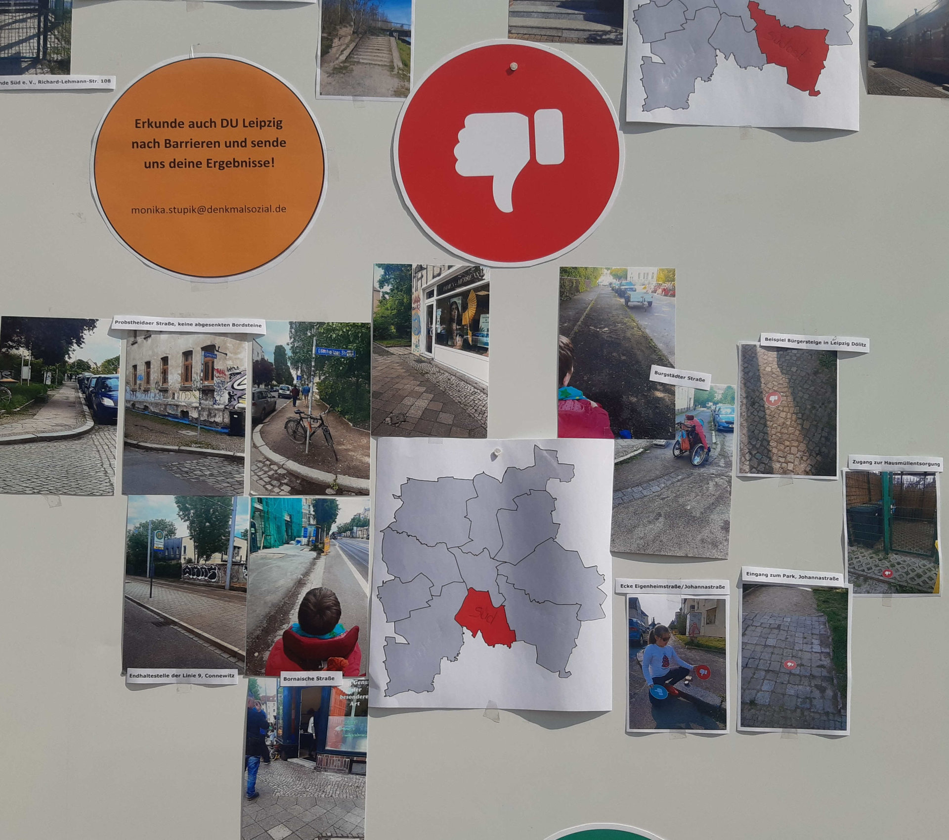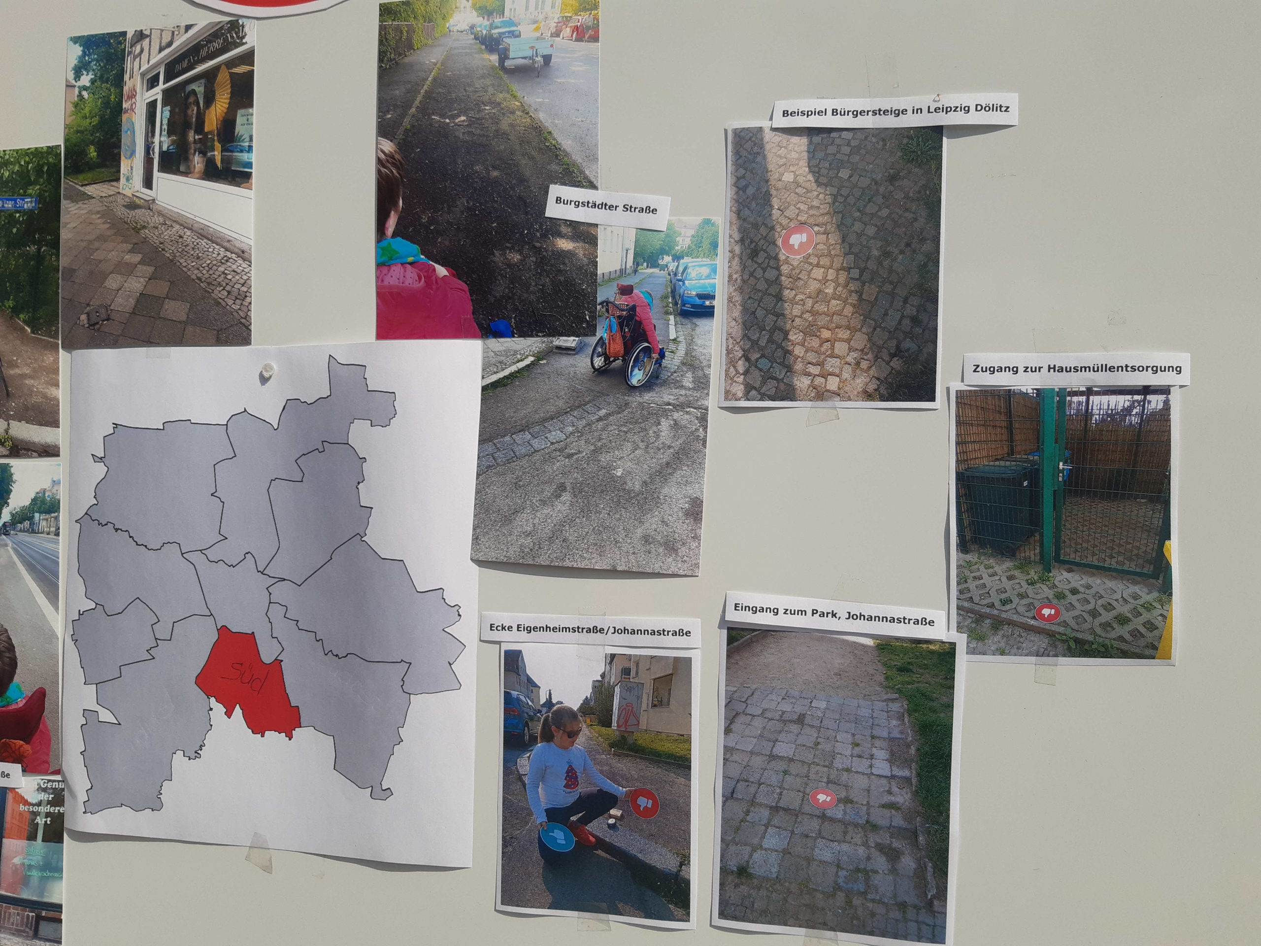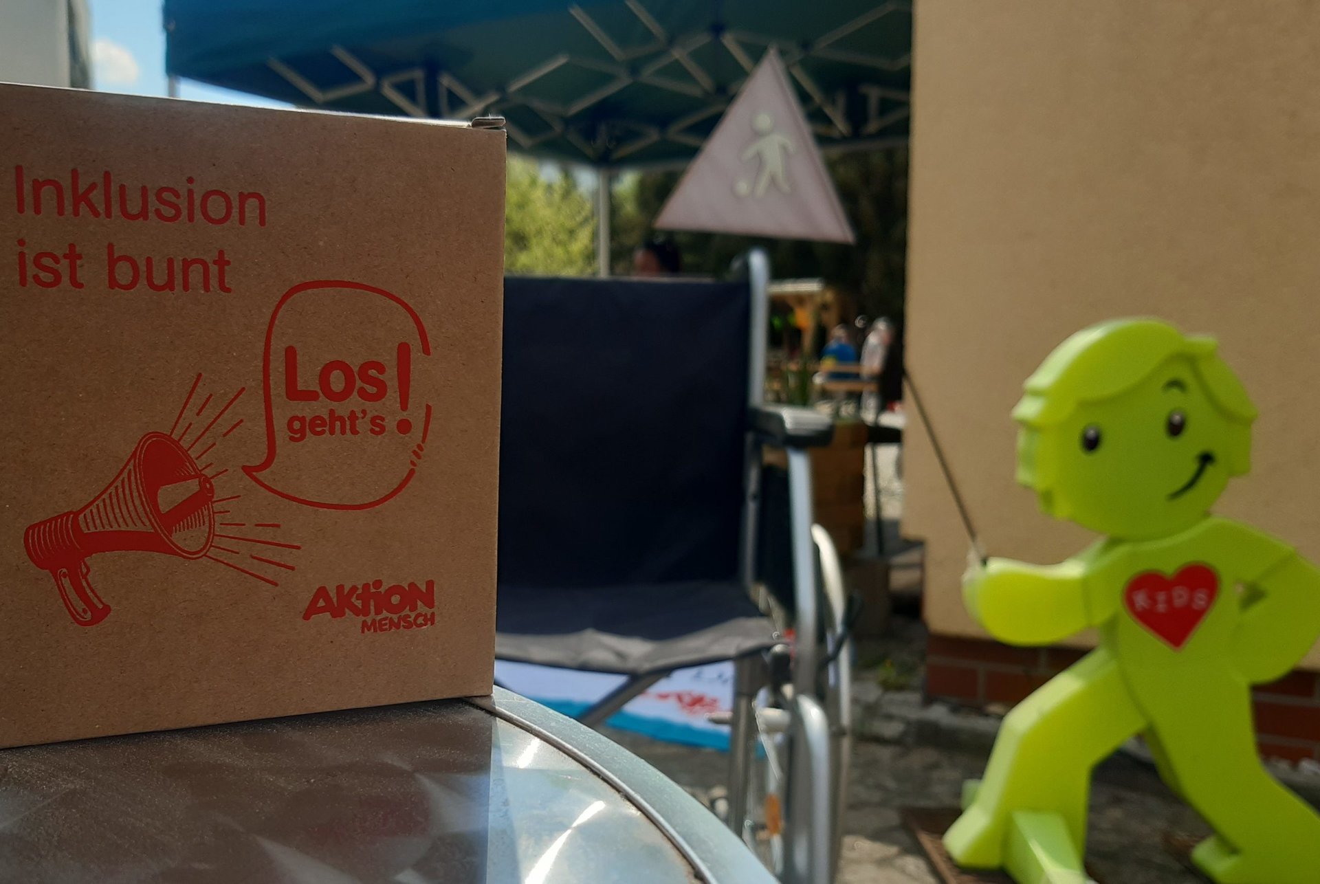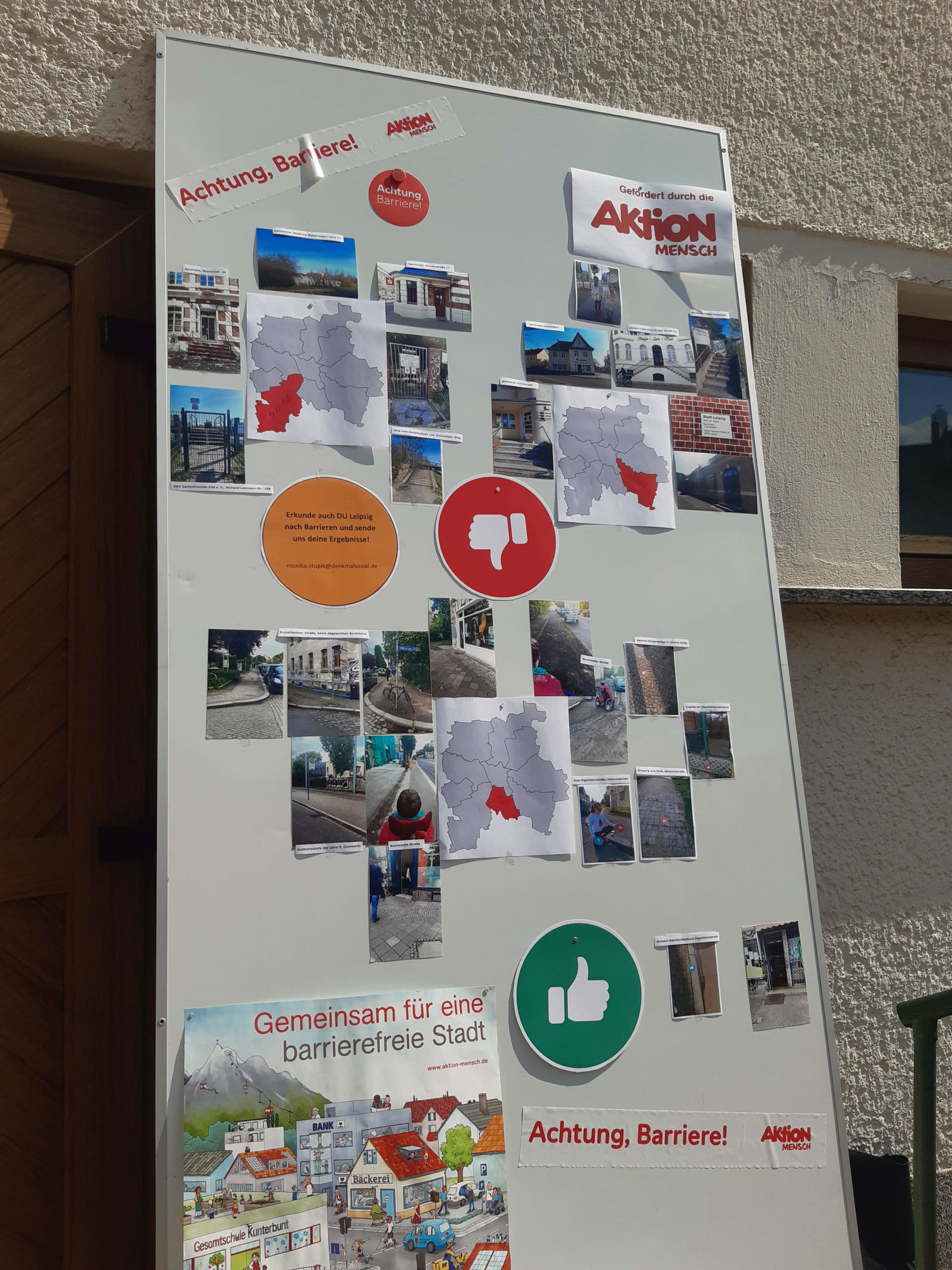 Ganz im Zeichen des diesjährigen Mottos „Tempo machen für Inklusion – barrierefrei zum Ziel“ machten wir in Leipzig Orte ausfindig, an denen keine oder wenig Barrierefreiheit herrscht. Wir bezogen Menschen aus verschiedenen Ecken Leipzigs ein, um möglichst viele Stadtteile diesbezüglich kennenzulernen. Sie „erforschten“ mit Hilfe der von der Aktion Mensch zur Verfügung gestellten Aktionsmittel den Weg zu unserem Gelände um herauszufinden, wo Barrierefreiheit fehlt. Die Personen, ob allein oder in der Gruppe, gingen unterschiedliche Wege und nutzten verschiedene Verkehrsmittel, um unseren Hof zu erreichen. Zur besseren Dokumentation begleiteten wir einige Teilnehmer*innen mit der Fotokamera. Die Ergebnisse nutzten wir in Form von Plakaten als Grundlage zum Austausch. Auf dem inklusiven Hof selbst stand ein Rollstuhl bereit, mit dem sich Interessierte einen kleinen Einblick in die Welt von rollstuhlnutzenden Menschen verschaffen konnten.