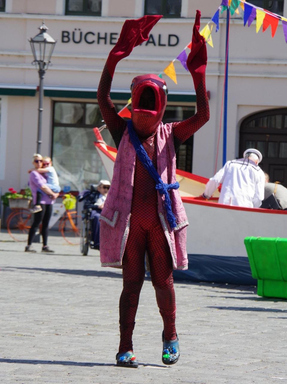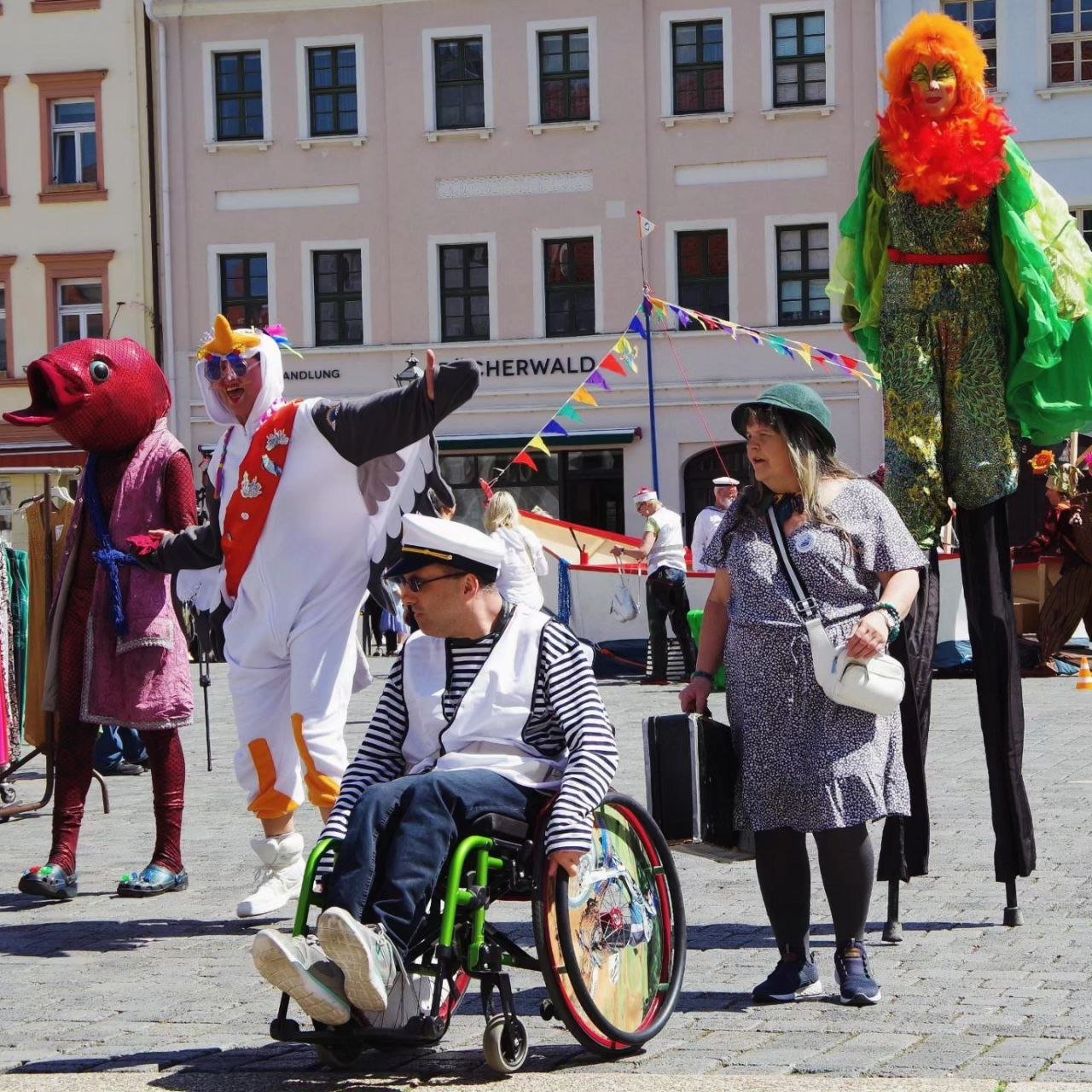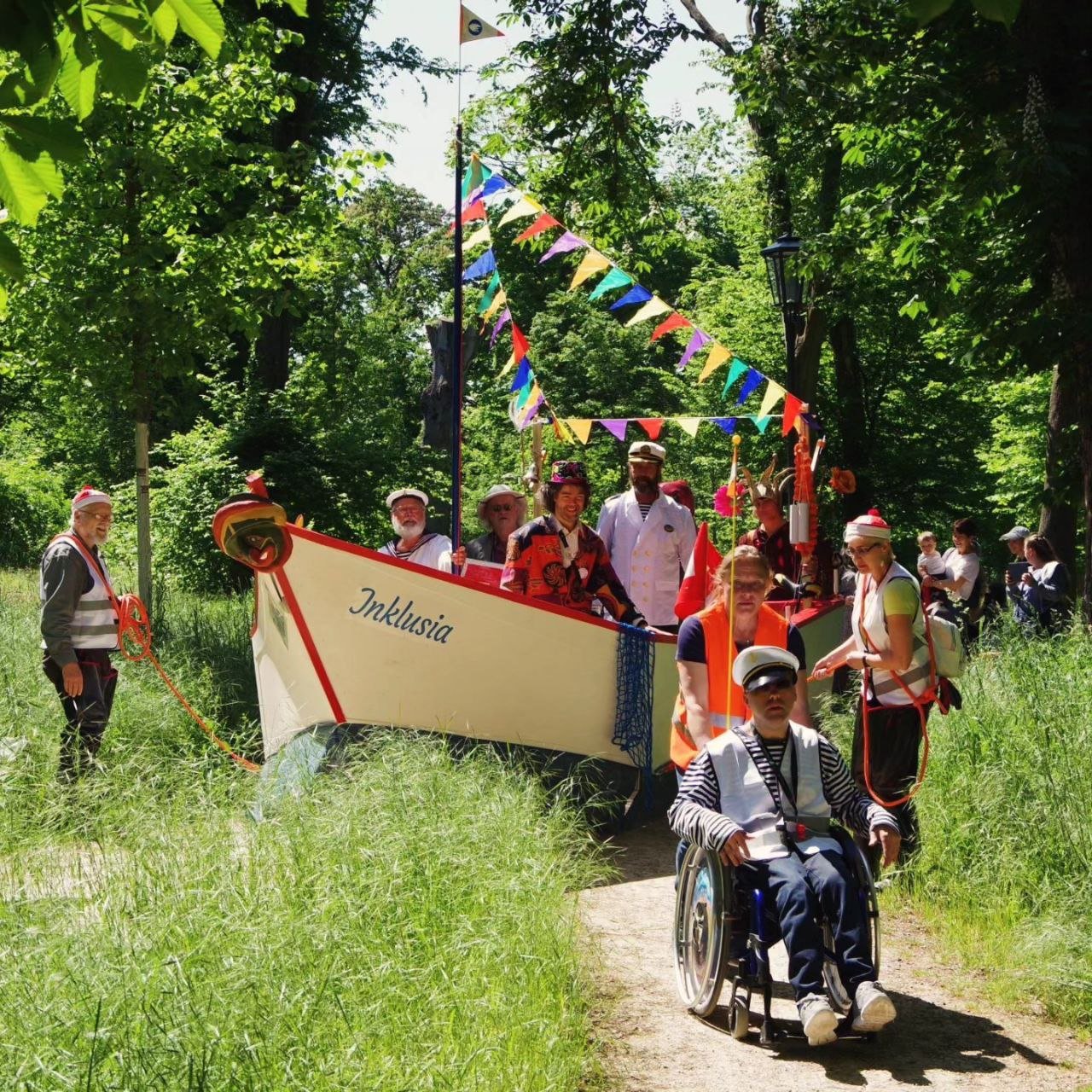 Die Besatzung dieses außergewöhnlichen Schiffes bestand aus einer vielfältigen Gruppe von Menschen: professionellen Künstler*innen, Menschen mit Behinderungen, kreativen Senior*innen und engagierten Bürger*innen. Gemeinsam führten sie eine interaktive Theaterperformance durch die Straßen von Torgau zum Laga-Gelände, begleitet von humorvollen Zwischenstopps und inspirierenden Momenten.