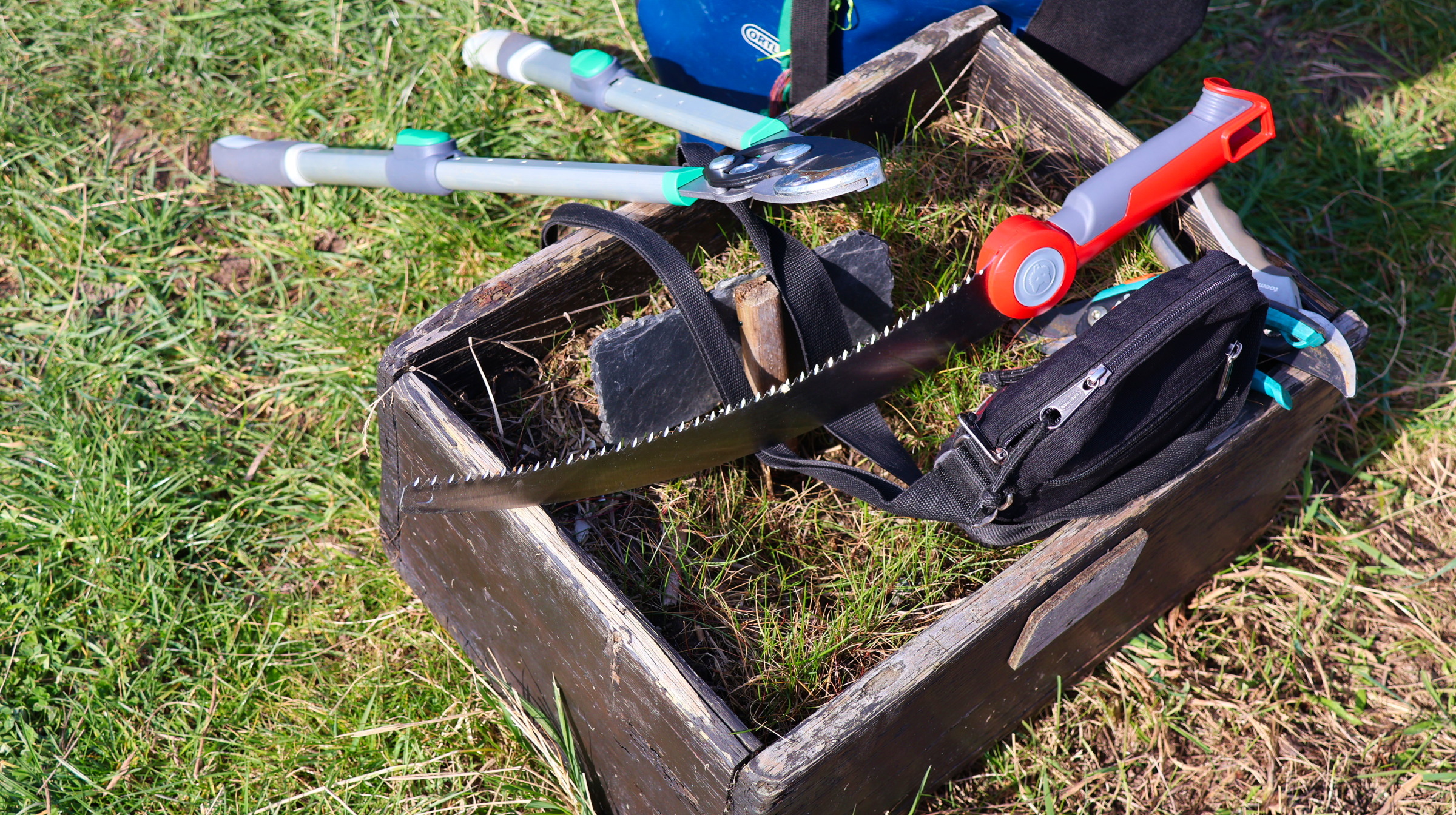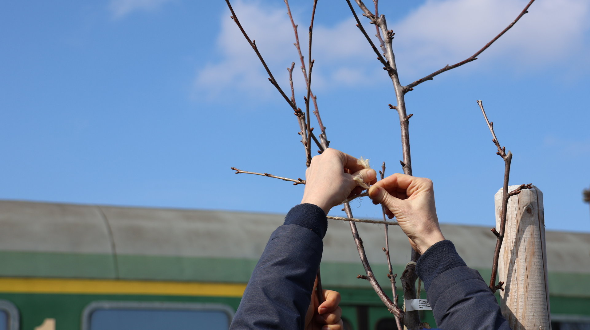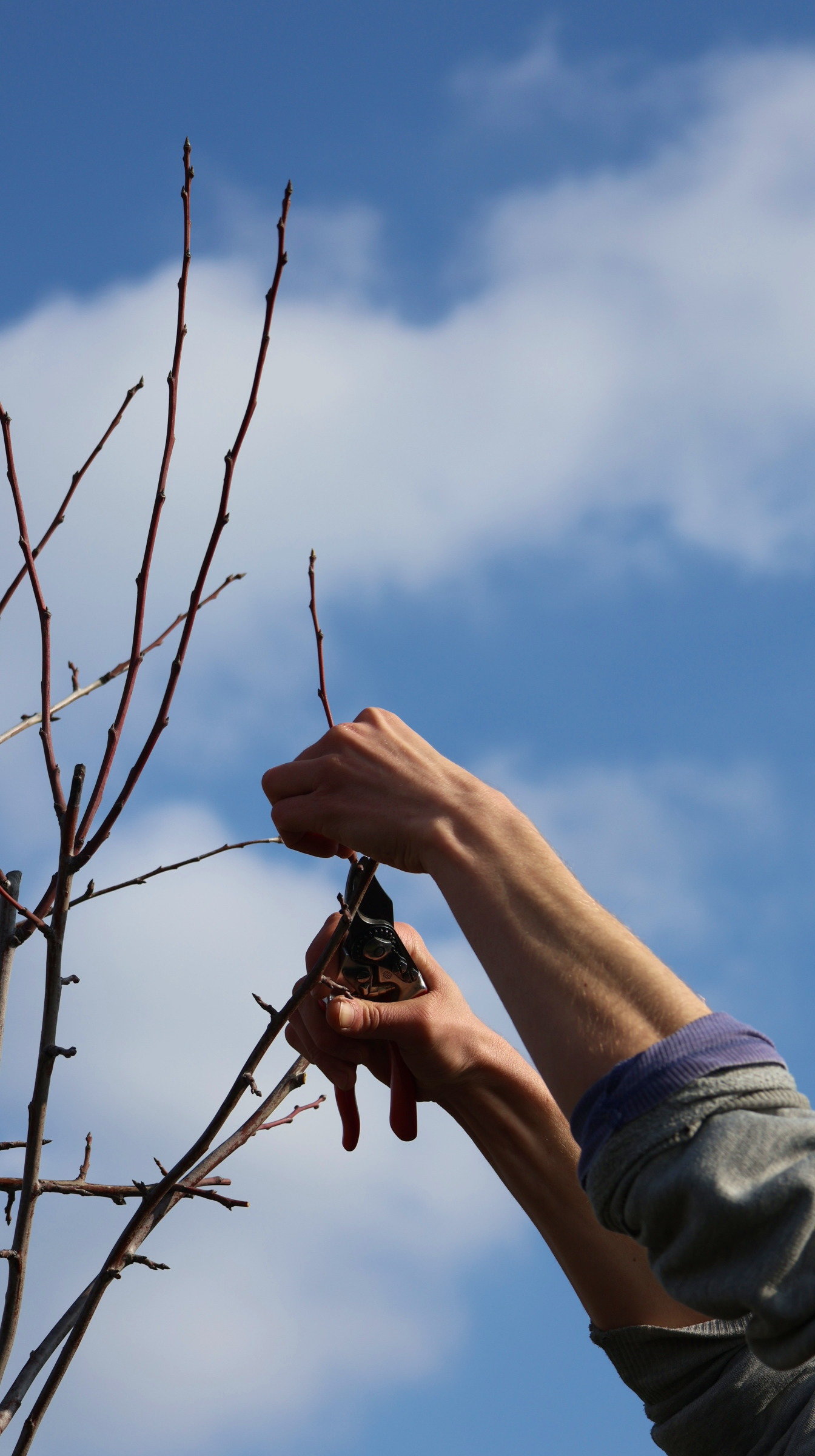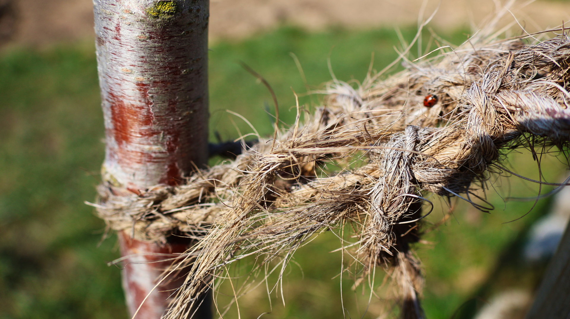 Mit professioneller Hilfe haben wir dann entschieden wo und wie wir Zweige abschneiden oder absägen müssen, um den Baum bei einem gesunden Wuchs zu unterstützen. Um dem Baum möglichst wenig Wunden zuzufügen, haben wir hierbei auch darauf geachtet, an welchen Stellen wir Äste mit kleinen Zweigen spreizen oder mit Stricken binden können. Dazu haben wir Naturfasern verwendet, so dass auch eine eingewachsene Stelle, dem Baum wenig schadet.