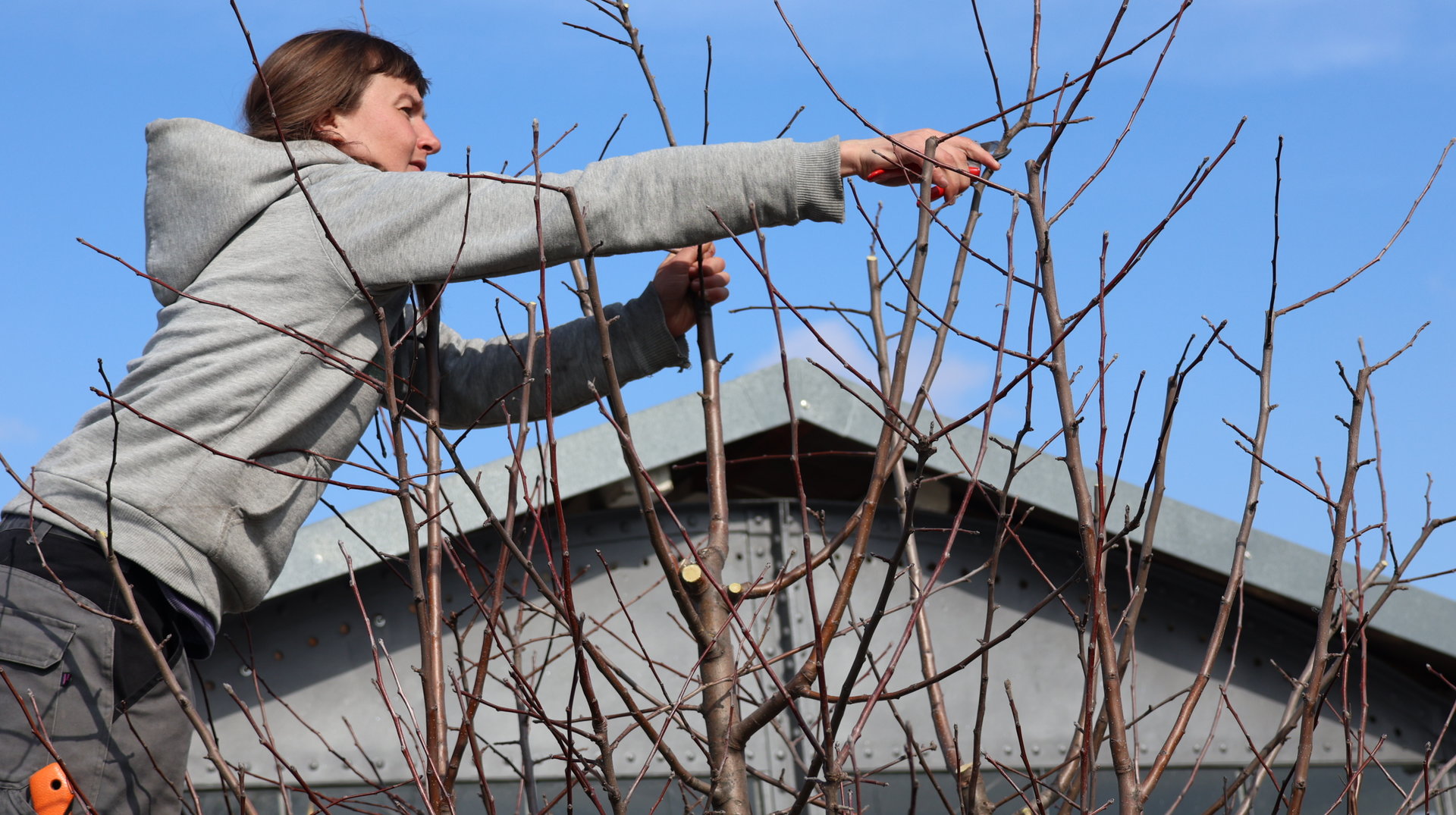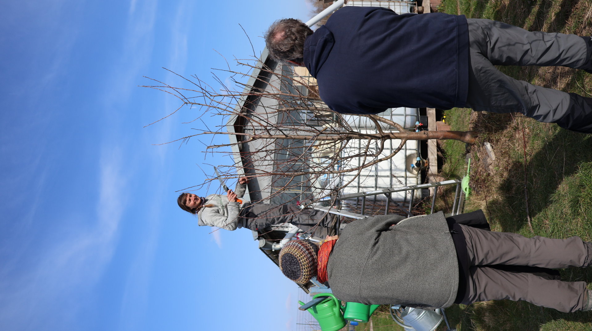 Am 09.März konnten wir bei herrlichem Wetter endlich den Folgeworkshop zum Obstbaumschnitt in unserem wunderbaren Hildegarten umsetzten. Wir haben Bäume besprochen, ihre Umgebung, ihren Wuchs und den Baum als solchen betrachtet. Wie wächst er? Welche Sorte ist es? Ist die Veredlungsstelle gut verheilt und liegt frei? Steht der Baum in einer leichten Senke, so dass sich bei ihm Wasser sammeln kann? Sind an ihm Stricke oder Bänder befestigt, die einschneiden können? Wie viel ist er im vergangenen Jahr gewachsen? Und wohin soll er noch wachsen? All das haben wir eingehend betrachtet, bevor wir in mit dem Schneiden begonnen haben.