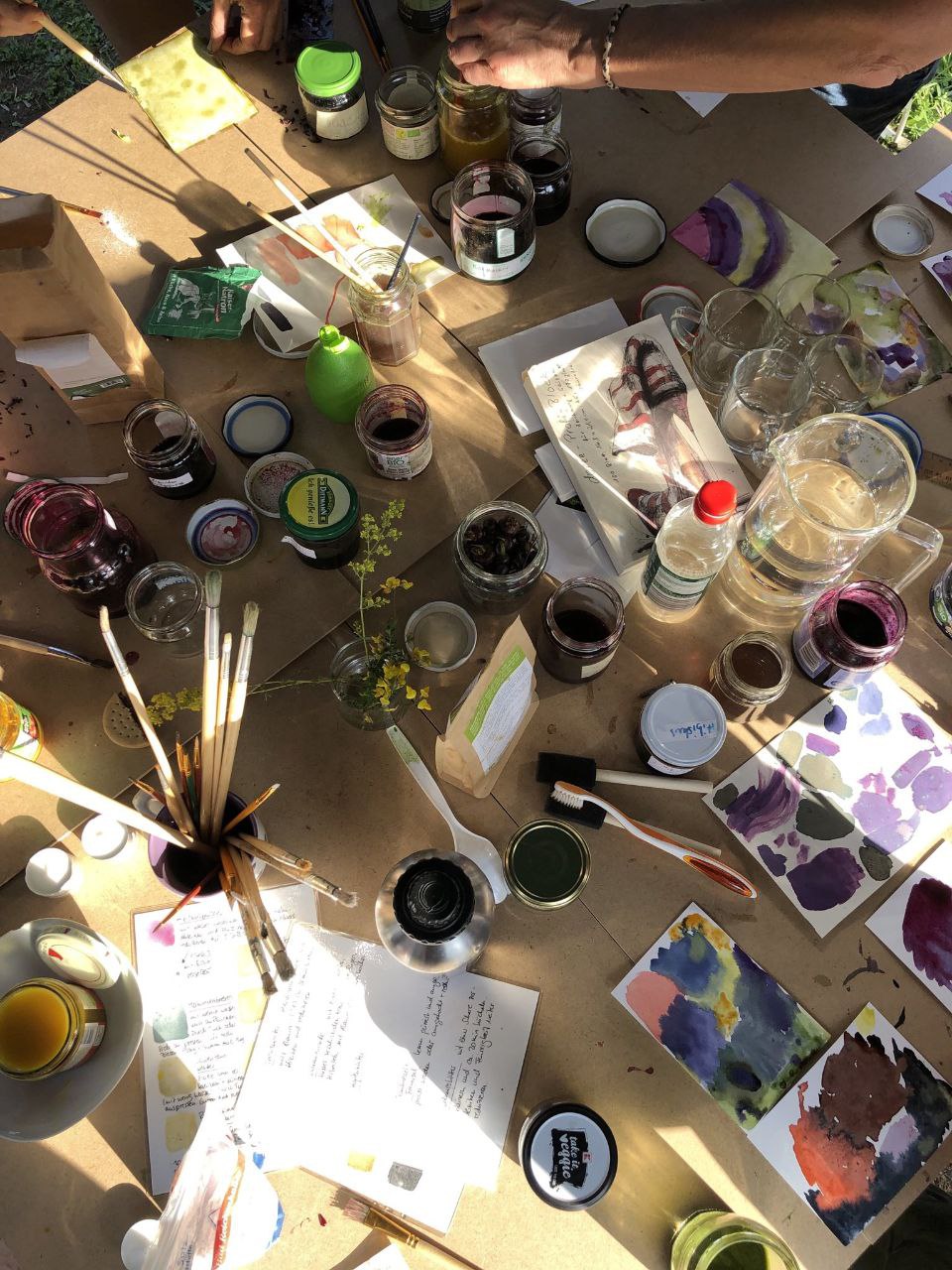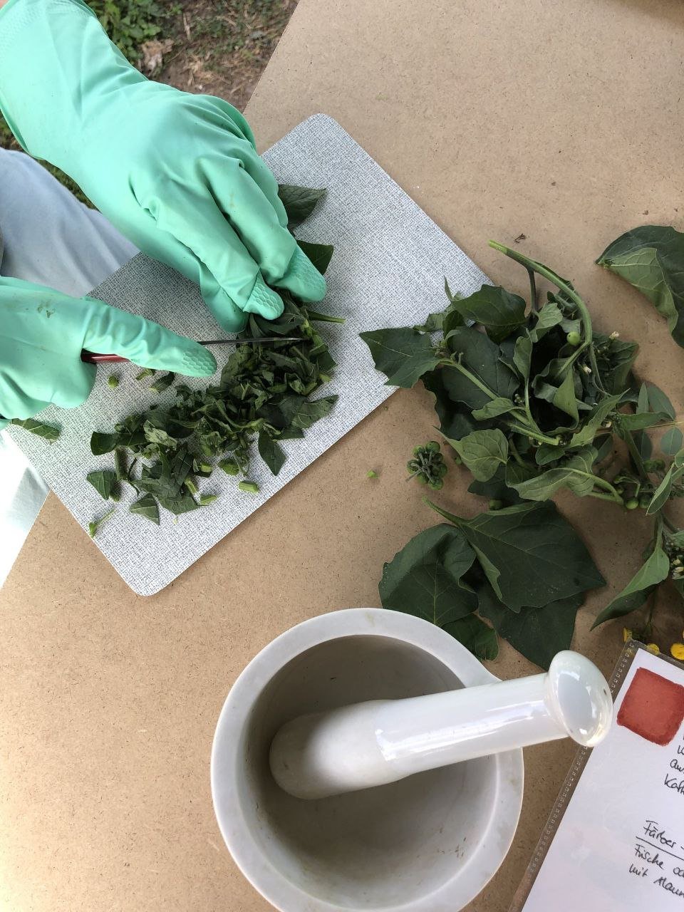 In diesem Workshop haben wir mit den Pflanzenfarben der Natur experimentiert! Aus Kräutern, Blüten und Beeren haben wir Pflanzenfarben extrahiert und gelernt, was es dabei zu beachten gilt. Wir haben z.T. mit giftigen, zum Teil mit genießbaren Pflanzen gearbeitet und dabei die unterschiedlichsten Eigenschaften verschiedener Gewächser näher kennengelernt. In unserem artenreichen Gemeinschaftsgarten DILL fanden wir ein üppiges Angebot an nutzbaren Blättern und Beeren vor, mit dem wir direkt vor Ort mit der Farbgewinnung starten konnten.