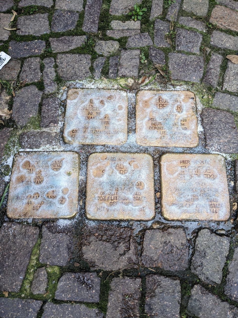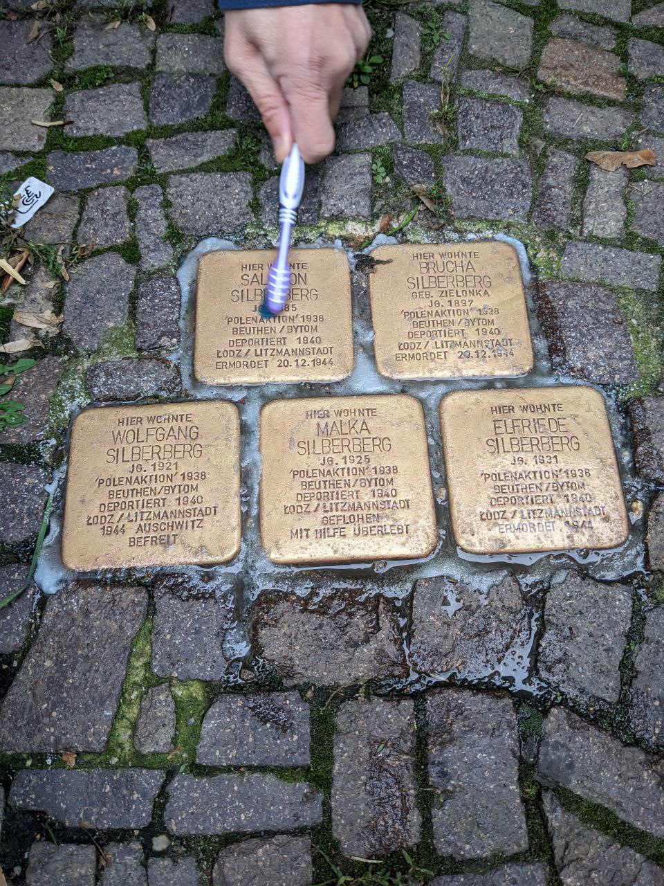 1938 brannten im gesamten Deutschen Reich Synagogen. Zum 85. Jahrestag dieser Übergriffe haben wir am 09. November den Opfern der Reichsprogromnacht gedacht, und all derer, die noch gefolgt sind. Im Gedenken an die Verstorben haben wir die Stolpersteine Familie Silberberg geputzt, von Salomon Chaim, Brucha, Wolfgang, Malka und Elfriede.